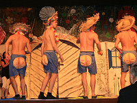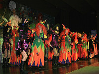 | Doch es entsteht ein "Super-Kessel Buntes"! Die Unentbehrlichen tanzen in farbenfrohen Kostüme auf der Bühne. |