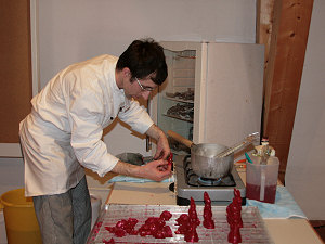 Ein Konditormeister zeigte, wie man Zuckerhasen goss.
